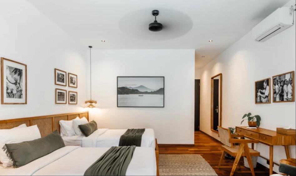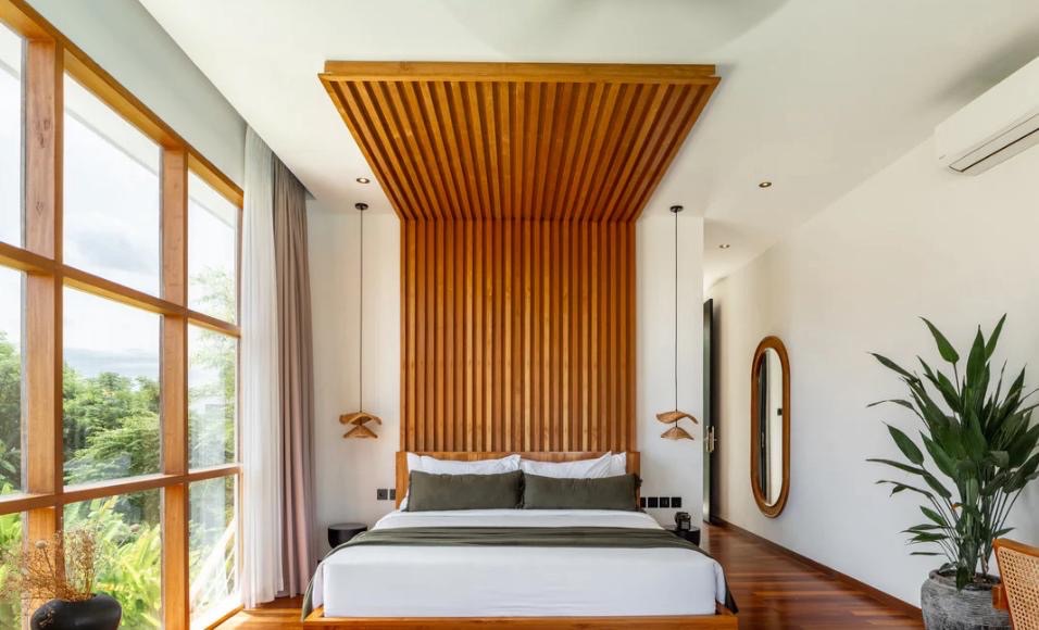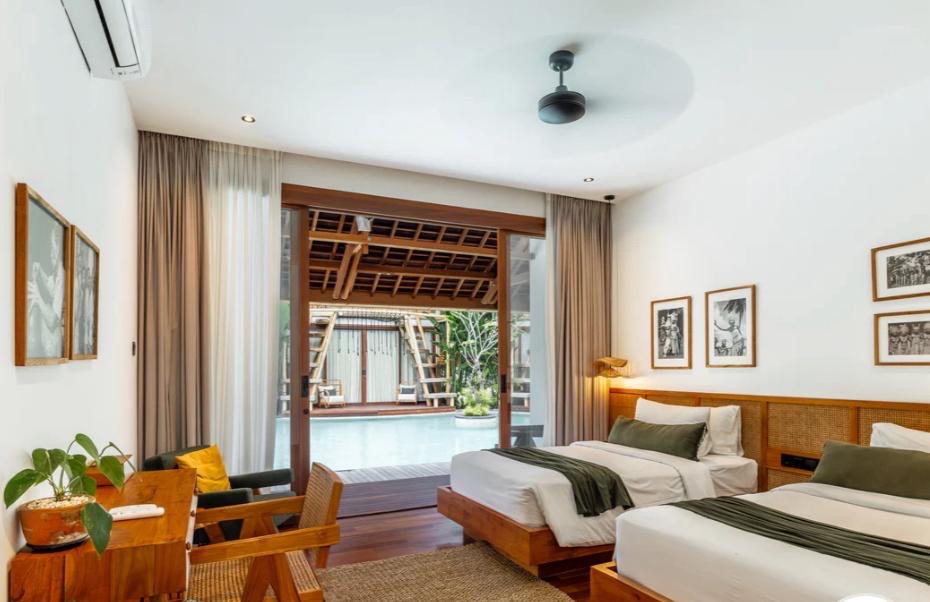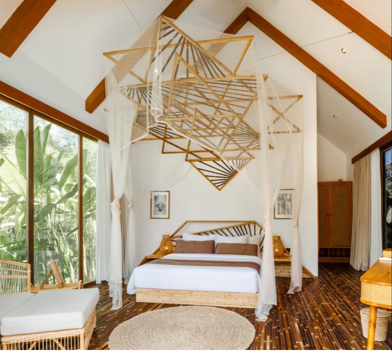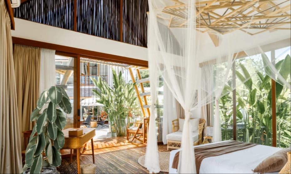 A unique & exclusive room, with a stunning floor-to-ceiling window overlooking the yoga shala and lush rice fields, offering a deeply tranquil and intimate retreat atmosphere.